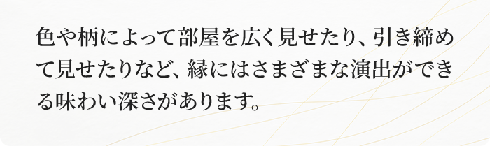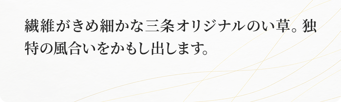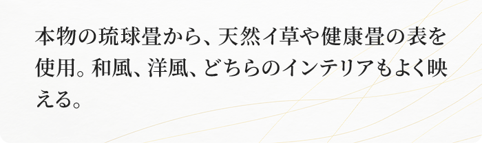 畳の上にじゅうたんを敷くのは、い草の呼吸を止めるようなもの。掃除も行き届かず、ダニやカビの原因になります。 新しい畳の香りと感触を存分に味わってください。素足で歩くと畳表にツヤも出て、生き生きとしてきますよ。